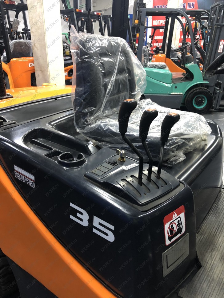 Дизельный автопогрузчик Doosan D35C-7 с инвентарным номером КМ098 2018 года выпуска. Имеет грузоподъемность 3500 кг. Гарантия: 3 мес или 500 м/час.