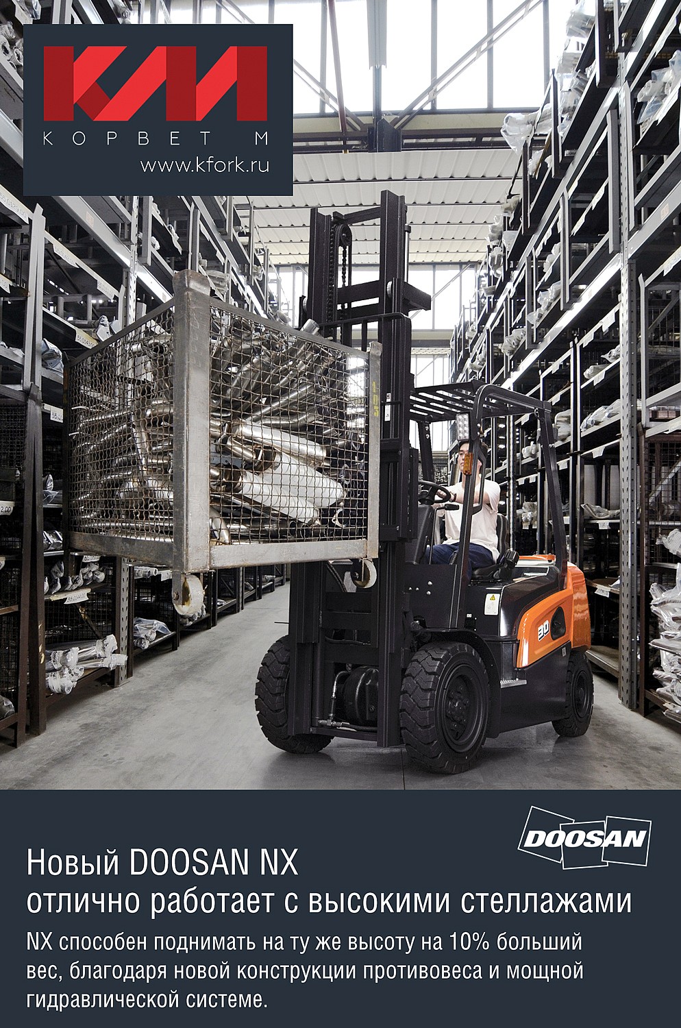 Вилочный погрузчик Doosan NX - работа с высокими стеллажами